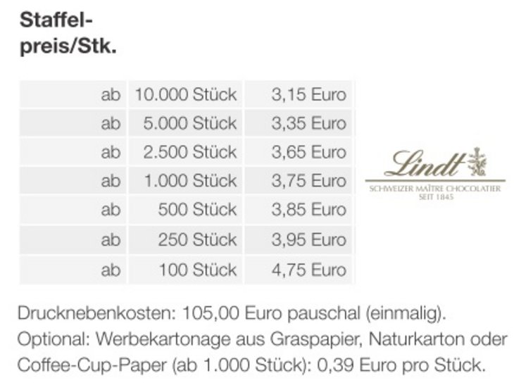 Preisliste Werbe-Osterei mit Schokoladenmischung von Lindt mit Logo Details