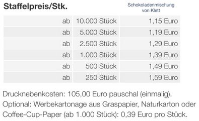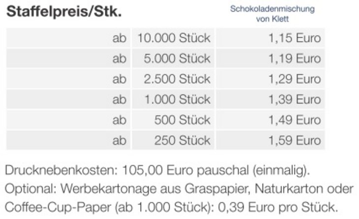 Die individuell bedruckbare Oster-Box ist das perfekte Präsent für Kunden und Mitarbeiter. Gefüllt mit feinster Markenschokolade sorgt sie für echte Genussmomente und frühlingshafte Freude. Ob im Büro, als Mailing-Beigabe oder Give-Away – diese hochwertige Werbeverpackung verbreitet Osterstimmung und Wertschätzung gleichermaßenProdukt: Individuelle Präsentverpackung aus hochwertiger Kartonage mit süßer FüllungMaße: ca. 63 x 54 x 26 mmNachhaltigkeit: Für jede Bestellung mit uns wird ein Baum über GROW MY TREE gepflanzt. Wir verwenden FSC ® -zertifizierten Karton aus nachhaltiger Forstwirtschaft und anderen kontrollierten QuellenBedruckung/Material: 4-farbiger Druck auf grafischem Premium-Karton (FSC ® -zertifiziert). Optional auf Graspapier, Naturkarton oder Coffee-Cup-PaperInhalt: Vollmilch Schokoladenmischung ca. 18,5g, bestehend aus 1 Stück Schokoladen-Ei, bunt gemischt und einem Osterhasen von KlettHaltbarkeit: Bis 30.06. diesen JahresLieferzeit: ca. 15 Arbeitstage ab Druckfreigabe oder nach AbspracheMindestbestellmenge: 250 Stück