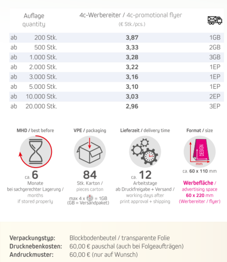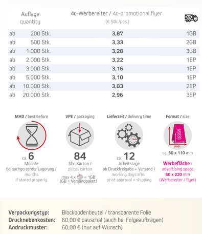 Produkt: Blockbodenbeutel / transparente FolieInhalt: Schoko-Ostereier 25g (6 Stck.)Format: ca. 60 x 110 mmWerbefläche: 4c-Werbereiter 60 x 220 mm Lieferzeit: ca. 12 Arbeitstage ab Druckfreigabe + VersandVPE: 84 Stk. / KartonHaltbarkeit: ca. 6 Monate bei sachgerechter LagerungMindestbestellmenge: 200 Stck.