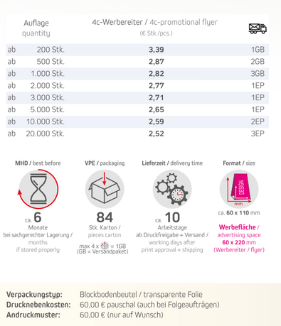 Produkt: Blockbodenbeutel / transparente FolieInhalt: Schoko-Ostereier 25g (6 Stck.)Format: ca. 60 x 110 mmWerbefläche: 4c-Werbereiter 60 x 220 mm Lieferzeit: ca. 10 Arbeitstage ab Druckfreigabe + VersandVPE: 84 Stk. / KartonHaltbarkeit: ca. 6 Monate bei sachgerechter LagerungMindestbestellmenge: 200 Stck.