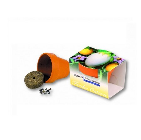 Beschreibung: Der Eierbaum ist eine Topfpflanze und bildet nach der Blüte kleine eiförmige Früchte. Diese gehören zu der Gattung der Aubergine. Ein Werbeaufdruck im Standardmotiv oder eine eigene Gestaltung der Banderole ist ab 250 Stück möglich.Format: 60 x 50 x 40 mmGewicht: 40gSamen: EierbaumInhalt: Tontöpfchen Ø 4 cm, Erdtablette, Samen: EierbaumsamenWerbefläche: 30x10 mm Tampondruck auf Töpfchen, 48x15 mm auf Standardmotiv Banderole Werbefläche Alternativ: 183x60 mm eigene Gestaltung BanderoleMindestbestellmenge: 250 Stück