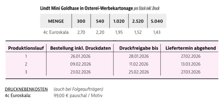 Lindt Mini Goldhase aus Alpenvollmilchschokolade in individuell bedruckter Klemmkartonage in QuadratformInhalt: Alpenvollmiclchschokolade Gewicht: Inhalt ca. 10 gVerpackungsmaß: ca. 80 x 105 mmDruckart: 4c EuroskalaVerpackungseinheit: 60 St. im Karton / 360 St. im UmkartonHaltbarkeit: ca. bis 31.07.2026 bei sachgerechter LagerungMindestbestellmenge: 300 StückLieferzeit: siehe Preisliste!