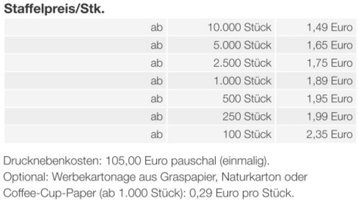 Süße Werbung mit zartschmelzender Schokolade! Klein, aber oho: Der Milka Schmunzelhase 15 g aus zarter Milka Alpenmilchschokolade ist überall beliebt.Produkt: Milka Schmunzelhase, verpackt in einer individuellen Werbekartonage.Nachhaltigkeit: Für jede Bestellung mit uns wird ein Baum über GROW MY TREE gepflanzt. Wir verwenden FSC ® -zertifizierten Karton aus nachhaltiger Forstwirtschaft und anderen kontrollierten QuellenBedruckung/Material: 4-farbiger Druck auf grafischem Premium-Karton (FSC ® -zertifiziert).Optional auf Graspapier, Naturkarton oder Coffee-Cup-PaperVerpackung: 210 Stück pro Karton, 8.820 Stück pro PaletteInhalt: 1 Milka Schmunzelhase 15g. Maße: ca. 80 x 35 x 27 mm.Haltbarkeit: Bis mindestens 30.06. diesen JahresLieferzeit: ca. 10 - 15 ArbeitstageMindestbestellmenge: 100