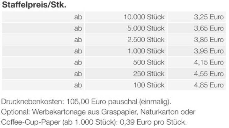 Zum Verstecken viel zu schade! Das individuell bedruckbare Osternest mit einer hochwertigen Schokoladenmischung macht Ihre Werbung einzigartig und garantiert höchste Aufmerksamkeit.Nachhaltigkeit: Für jede Bestellung mit uns wird ein Baum über GROW MY TREE gepflanzt. Wir verwenden FSC ® -zertifizierten Karton aus nachhaltiger Forstwirtschaft und anderen kontrollierten QuellenProdukt: Schokoladenmischung von Milka, in einem individuell bedruckbaren Osternest aus hochwertiger Kartonage, mit Ostergras dekoriert.Bedruckung/Material: 4-farbiger Druck auf grafischem Premium-Karton (FSC ® -zertifiziert).Optional auf Graspapier, Naturkarton oder Coffee-Cup-PaperInhalt: Schokoladenmischung von Milka ca. 39g, bestehend aus 3 Stück Alpenmilch-Eier und einem Milka Schmunzelhasen.Maße: ca. 100 x 100 x 20 mm.Verpackung: 72 Stück pro Karton, 3.024 Stück pro PaletteHaltbarkeit: Bis mindestens 30.06. diesen Jahres Lieferzeit: ca. 10-15 Arbeitstage nach DruckfreigabeZubehör: Stabiler Einzelkarton für den Postversand an Ihre Kunden 0,59 Euro pro StückMindestbestellmenge: 100 Stück