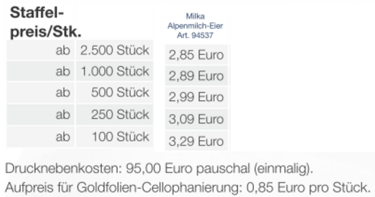 Preisliste Schoko-Eier 6er-Set Milka Alpenmilch mit Logo Details