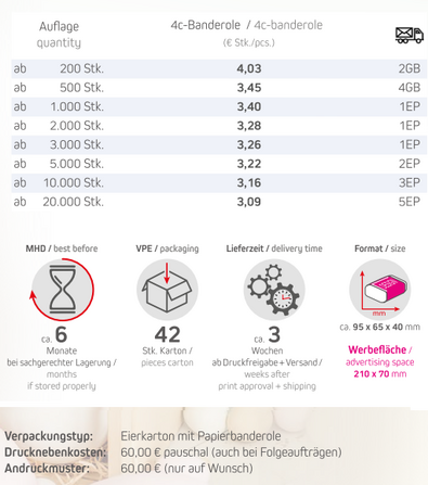 Inhalt. 6 Stk. Schokoeier 25gVerpackungstyp: Eierkarton mit PapierbanderoleFormat: ca. 95 x 65 x 40 mmDruck: 4c-DigitaldruckWerbefläche: Papierbanderole 210 x 70 mmLieferzeit: ca. 3 Wochen ab Druckfreigabe + VersandMindestmenge: 200 Stk.Haltbarkeit: ca. 6 Monate bei sachgerechter LagerungVerpackung: 42 Stück / KartonInhalt: Zutaten Schoko Ostereier: Zucker, Kakaobutter, Vollmilchpulver, Kakaomasse, Süßmolkepulver, Emulgator: Sojalecithine; Bourbon Venilleextrakt. Kann Spuren von Haselnüssen und Erdnüssen enthalten.