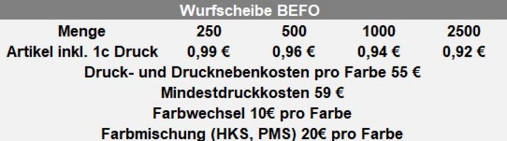 Preisliste Wurfscheibe BEFO mit Logo Details