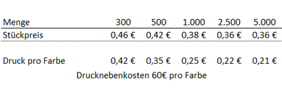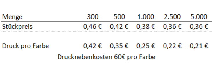 Maße: ca. 93 x 28 x 17 mmGewicht: 22 gDruckart: SiebdruckDruckfläche: 80 x20 mm (max. 4c)Verpackungs-Einheit: 1 verschrumpft / 500 je VersandkartonMindestmenge: 300 StückLieferzeit: ca. 10 Tage ab Druckfreigabe