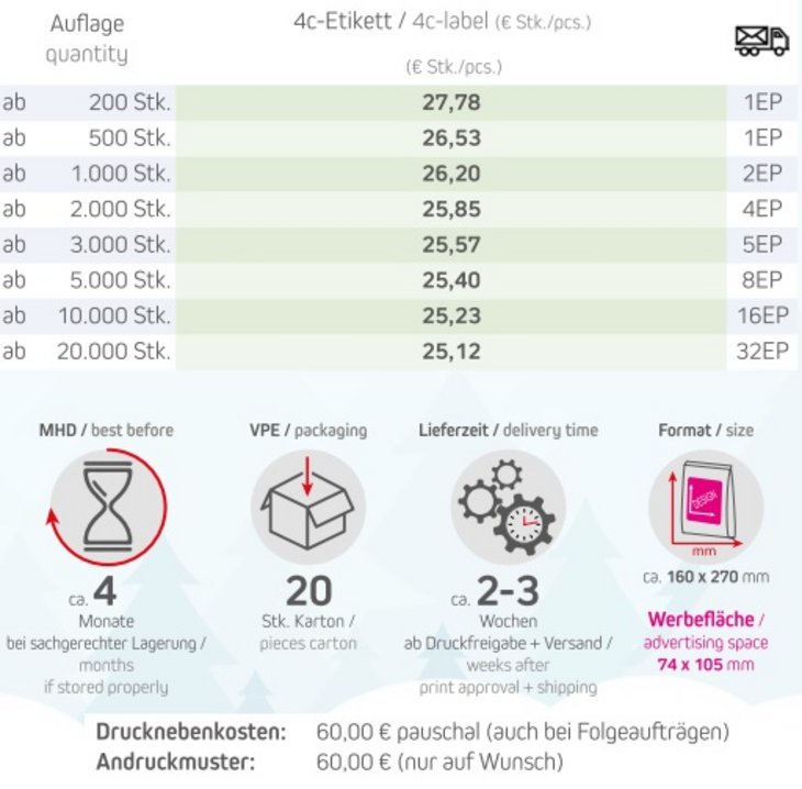 Standbeutel Maxi aus Kraftpapier. Werbeanbringung als Etikett in 4c individuell bedruckbar.Bringen Sie den Duft des Weihnachtsmarktes direkt zu Ihren Kunden mit unseren Bio Feuergebrannten Mandeln! Die zarten Mandeln sind meisterhaft geröstet, karamellisiert und mit einer verführerischen Mischung aus Zimt und Zucker überzogen. Diese aromatischen Leckerbissen sind der Inbegriff winterlicher Nascherei – wie frisch vom Weihnachtsmarkt oder der Kirmes. Ideal als Giveaway für Ihre Kunden, die sich nach einem Hauch von Tradition und festlichem Genuss sehnen. Mit den feinen, knusprigen Mandeln verbreiten Sie nicht nur süßen Genuss, sondern auch eine ganz besondere Weihnachtsstimmung.Verpackungstyp: Maxi Standbeutel mit StandartmotivInhalt: Feuergebrannte Bio Mandeln 500gFormat: ca. 160 x 270 x 30 mmWerbefläche: 105 x 148 mmHaltbarkeit: ca. 4 Monate bei sachgerechter LagerungLieferzeit: ca. 2-3 Wochen nach DruckfreigabeVerpackungseinheit: 20Stk. / KartonMindestbestellmenge: 200 StückZutaten Bio Feuergebrannte Mandeln: MANDELN*, Rohrohrzucker*, Zimt*, Kakao*, *aus kontrolliert biologischem Anbau.Nährwerte pro 100g: Energie: 2037 kJ / 488 kcal, Fett: 27 g, davon gesättigte Fettsäuren: 1,9 g, Kohlenhydrate: 52,3 g, davon Zucker: 49,8 g, Eiweiß: 9,4 g, Salz: <0,01 g