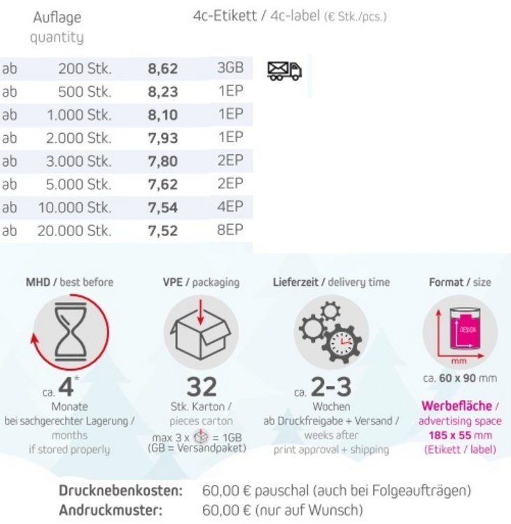 Verpackungstyp: Biologisch abbaubare Eco Pappdose Midi schwarzInhalt: Bio Zimt-Mandel Vanille-Cashew Mix ca.80gFormat: ca. 60 x 90 mmWerbefläche: 4c-Flügeletikett 185 x 55 mmHaltbarkeit: ca. 4 Monate bei sachgerechter LagerungLieferzeit: ca. 2-3 Wochen nach Druckfreigabe+ VersandVerpackungseinheit: 30 Stk. / KartonMindestbestellmenge: 200 Stück
