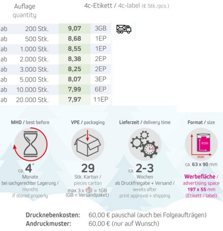 Metalldose Midi silber. Werbeanbringung als Etikett in 4c individuell bedruckbar. Verleihen Sie Ihrem nächsten Event oder Treffen eine fruchtige Note mit dem Zimt-Mandel Vanille-Cashew Mix. Die perfekte Kombination aus süßen, knusprigen Mandeln und Vanille-Cashews sorgt für ein Geschmackserlebnis der besonderen Art. Ideal als kleines Giveaway für Kunden, Geschäftspartner oder Ihre Gäste – diese Leckerei kommt immer gut an und versüßt den Moment.Verpackungstyp: Metalldose Midi Inhalt: Bio Zimt-Mandel Vanille-Cashew Mix ca. 100gFormat: ca. 63 x 90 mmWerbefläche: 4c-Flügeletikett 185 x 55 mmHaltbarkeit: ca. 4 Monate bei sachgerechter LagerungLieferzeit: ca. 2-3 Wochen nach Druckfreigabe+ VersandVerpackungseinheit: 28 Stk. / KartonMindestbestellmenge: 200 Stück