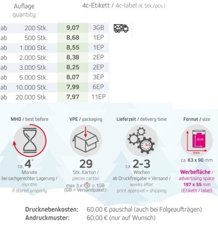 Metalldose Midi schwarz. Werbeanbringung als Etikett in 4c individuell bedruckbar. Verleihen Sie Ihrem nächsten Event oder Treffen eine fruchtige Note mit dem Zimt-Mandel Vanille-Cashew Mix. Die perfekte Kombination aus süßen, knusprigen Mandeln und Vanille-Cashews sorgt für ein Geschmackserlebnis der besonderen Art. Ideal als kleines Giveaway für Kunden, Geschäftspartner oder Ihre Gäste – diese Leckerei kommt immer gut an und versüßt den Moment.Verpackungstyp: Metalldose Midi schwarzInhalt: Bio Zimt-Mandel Vanille-Cashew Mix ca. 100gFormat: ca. 63 x 90 mmWerbefläche: 4c-Flügeletikett 185 x 55 mmHaltbarkeit: ca. 4 Monate bei sachgerechter LagerungLieferzeit: ca. 2-3 Wochen nach Druckfreigabe+ VersandVerpackungseinheit: 28 Stk. / KartonMindestbestellmenge: 200 Stück