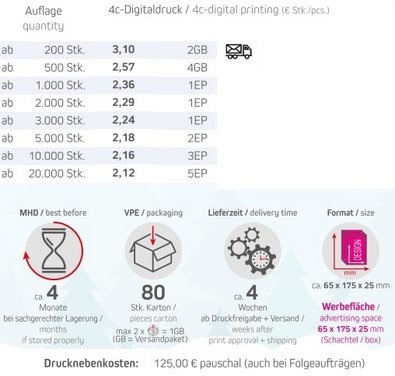 Artikel: gebrannte Mandeln 15gHaltbarkeit: ca. 4 Monate bei sachgerechter LagerungDruck: 4c Digitaldruck WerbekarteFomat:ca. 65 x 175 x 25 mm Werbefläche: 65 x 175 x 25 mm (Schachtel / box)Verpackungstyp: Faltschachtel mit Hänger / transparente Midi-TüteLieferzeit: ca. 4 Wochen ab DruckfreigabeMindestmenge: 200 StückZutaten Feuergebrannte Mandeln: MANDELN, Rohrohrzucker, Zimt, Kakao.Nährwerte pro 100g: Energie: 2037 kJ / 488 kcal, Fett: 27 g, davon gesättigte Fettsäuren: 1,9 g, Kohlenhydrate: 52,3 g, davon Zucker: 49,8 g, Eiweiß: 9,4 g, Salz: <0,01 g