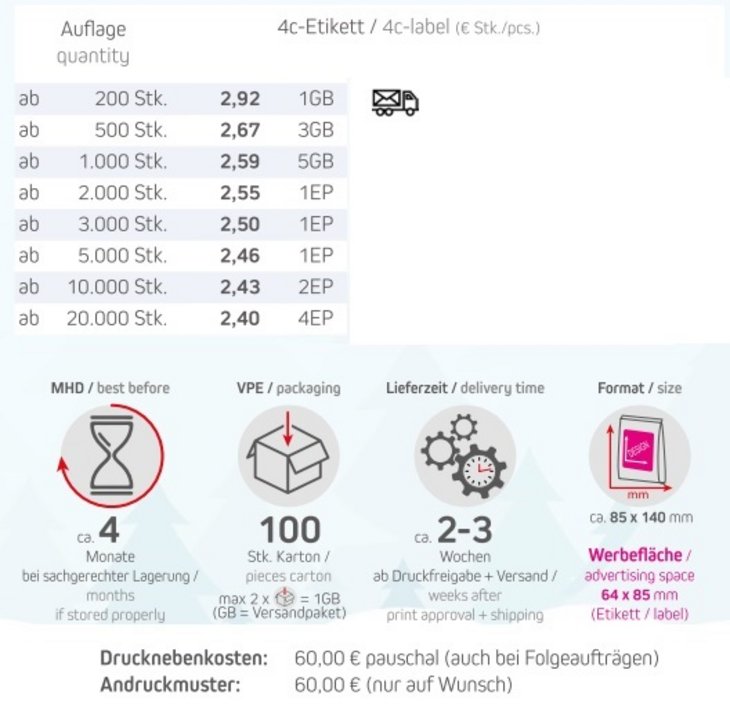 Edle Feuergebrannte Mandeln 30g in einem Mini Standbeutel, perfekt für jede Messe, Infostand oder für das Büro. Body Label individuell bedruckbar mit einem Firmenlogo oder Werbebotschaft.Artikel: Feuergebrannte Mandeln 30gHaltbarkeit: ca. 4 Monate bei sachgerechter LagerungDruck: 4c Digitaldruck WerbekarteWerbefläche: 74x95mmVerpackungstyp: Standbeutel Mini aus KraftpapierLieferzeit: ca. 2-3 Wochen nach Druckfreigabe + VersandOptional ist der Standbeutel auch in Schwarz erhältlich, Anfrage mit Art.-Nr. 01901 angebenMindestmenge: 200 StückZutaten Feuergebrannte Mandeln: Mandeln, Rohrohrzucker, Zimt, Kakao.