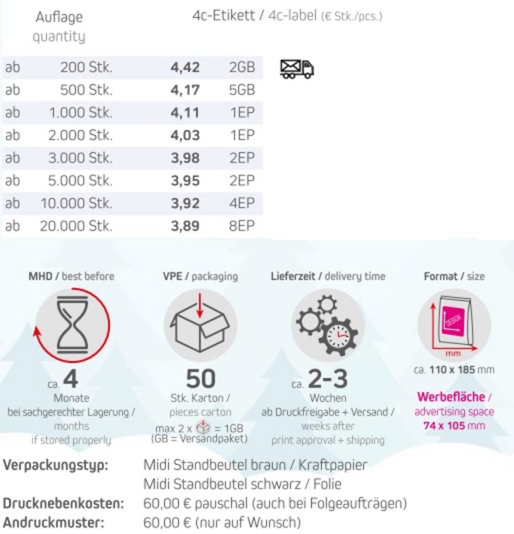 Preisliste Feuergebrannte Mandeln ca. 80g im Standbeutel Midi schwarz mit Logo Details