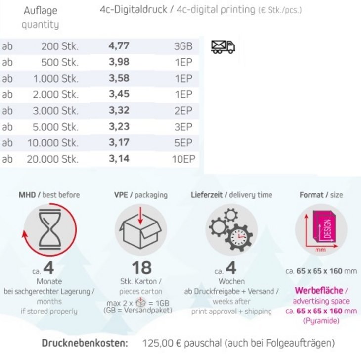 Präsent-Pyramide. Werbeanbringung als Direktdruck in 4c individuell bedruckbar.Verleihen Sie Ihrem nächsten Event oder Treffen eine fruchtige Note mit den Gebrannten Mandeln Himbeere. Die perfekte Kombination aus süßen, knusprigen Mandeln und dem intensiven Geschmack der Himbeere sorgt für ein Geschmackserlebnis der besonderen Art. Ideal als kleines Giveaway für Kunden, Geschäftspartner oder Ihre Gäste – diese Leckerei kommt immer gut an und versüßt den Moment.Verpackungstyp: Präsentbox in Pyramidenform aus KartonageInhalt: Gebrannte Mandeln Himbeere ca. 30gFormat: ca. 180 x 70 mmWerbefläche: ca. 65 x 65 x 160 mm (Pyramide)Haltbarkeit: ca. 6 Monate bei sachgerechter LagerungLieferzeit: ca. 3-4 Wochen ab Druckfreigabe + VersandVerpackungseinheit: 40 Stk. / KartonMindestbestellmenge: 200 StückZutaten Gebrannte Mandeln Himbeere: 48 % MANDELN, Zucker, Himbeeraroma, 1,8 % Aceto Balsamico (Weinessig, Traubenmostkonzentrat, Farbstoff: Ammoniumsulfit-Zuckerkulör, Antioxidationsmittel: Schwefeldioxid).Nährwerte pro 100g: Energie: 1820 kJ / 434 kcal, Fett: 22,8 g, davon gesättigte Fettsäuren: 1,8 g, Kohlenhydrate: 46,9 g, davon Zucker: 44,4 g, Eiweiß: 10,3 g, Salz: 0 g