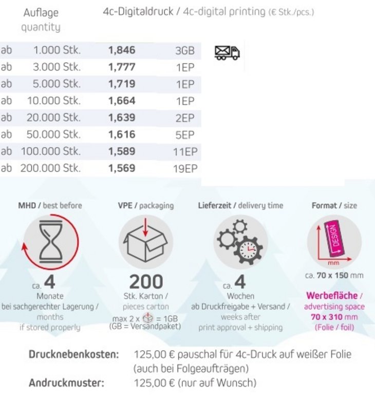 Snack Stick aus weißer Folie oder transparenter Folie. Werbeanbringung als Direktdruck in 4c individuell bedruckbar.Verleihen Sie Ihrem nächsten Event oder Treffen eine fruchtige Note mit den Gebrannten Mandeln Himbeere. Die perfekte Kombination aus süßen, knusprigen Mandeln und dem intensiven Geschmack der Himbeere sorgt für ein Geschmackserlebnis der besonderen Art. Ideal als kleines Giveaway für Kunden, Geschäftspartner oder Ihre Gäste – diese Leckerei kommt immer gut an und versüßt den Moment.Inhalt: Gebrannte Mandeln HimbeereHaltbarkeit: ca. 4 Monate bei sachgerechter LagerungNetto-Gewicht: ca. 25gVerpackungstyp: transparente oder weiße FolieFormat: Midi-Tüte B 70 x H 150 mmWerbefläche: 70 x 310 mmLieferzeit: ca. 3-4 Wochen ab Druckfreigabe + VersandVerpackung: 200 Stück / KartonDruckart: DigitaldruckMindestmenge: 1000 Stk.