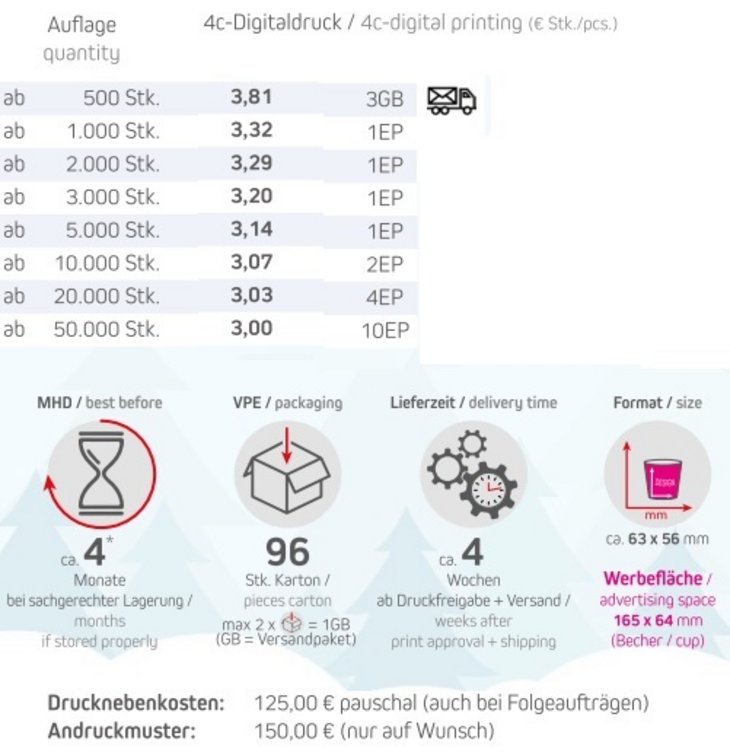 Snackbecher Mini aus Papier. Werbeanbringung als Direktdruck in 4c individuell bedruckbar.Verleihen Sie Ihrem nächsten Event oder Treffen eine fruchtige Note mit den Gebrannten Mandeln Himbeere. Die perfekte Kombination aus süßen, knusprigen Mandeln und dem intensiven Geschmack der Himbeere sorgt für ein Geschmackserlebnis der besonderen Art. Ideal als kleines Giveaway für Kunden, Geschäftspartner oder Ihre Gäste – diese Leckerei kommt immer gut an und versüßt den Moment.Verpackungstyp: PappbecherInhalt: Gebrannte Mandeln Himbeere ca. 40gFormat: ca. 63 x 56 mmWerbefläche: 165 x 64 mm komplett rundumHaltbarkeit: ca. 4 Monate bei sachgerechter LagerungLieferzeit: ca. 4 Wochen nach DruckfreigabeVerpackungseinheit: 96Stk. / KartonMindestbestellmenge: 500 StückZutaten Gebrannte Mandeln Himbeere: 48 % MANDELN, Zucker, Himbeeraroma, 1,8 % Aceto Balsamico (Weinessig, Traubenmostkonzentrat, Farbstoff: Ammoniumsulfit-Zuckerkulör, Antioxidationsmittel: Schwefeldioxid).Nährwerte pro 100g: Energie: 1820 kJ / 434 kcal, Fett: 22,8 g, davon gesättigte Fettsäuren: 1,8 g, Kohlenhydrate: 46,9 g, davon Zucker: 44,4 g, Eiweiß: 10,3 g, Salz: 0 g