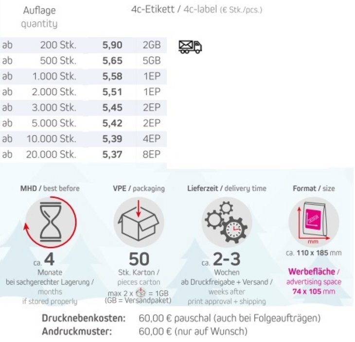 Gebrannte Mandeln Himbeere 80g in einem Mini Standbeutel, perfekt für jede Messe, Infostand oder für das Büro.Body Label individuell bedruckbar mit einem Firmenlogo oder Werbebotschaft.Artikel: Gebrannte Mandeln Himbeere ca. 80gHaltbarkeit: ca. 4 Monate bei sachgerechter LagerungDruck: 4c Digitaldruck WerbekarteWerbefläche: 74 x 105 mmVerpackungstyp: Standbeutel Midi aus Kraftpapier ca. 110 x 185 mmLieferzeit: ca. 2-3 Wochen nach Druckfreigabe + Versand Optional ist der Standbeutel auch in Schwarz erhältlich, Anfrage mit Art.-Nr. 02101 angebenMindestmenge: 200 StückZutaten Gebrannte Mandeln Himbeere: 48 % MANDELN, Zucker, Himbeeraroma, 1,8 % Aceto Balsamico (Weinessig, Traubenmostkonzentrat, Farbstoff: Ammoniumsulfit-Zuckerkulör, Antioxidationsmittel: Schwefeldioxid).Nährwerte pro 100g: Energie: 1820 kJ / 434 kcal, Fett: 22,8 g, davon gesättigte Fettsäuren: 1,8 g, Kohlenhydrate: 46,9 g, davon Zucker: 44,4 g, Eiweiß: 10,3 g, Salz: 0 g