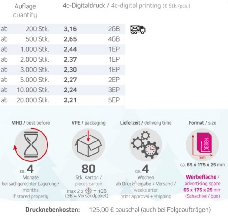 Werbefläche: 65 x 175 x 25 mm (Schachtel / box)