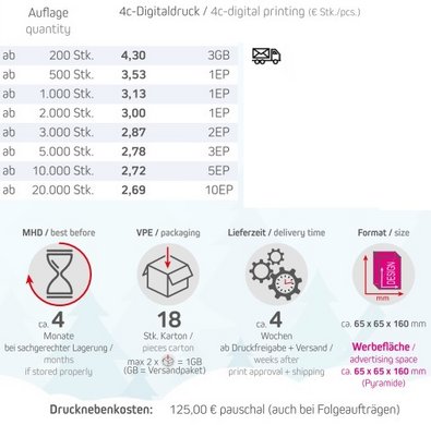 Präsent-Pyramide. Werbeanbringung als Direktdruck in 4c individuell bedruckbar.