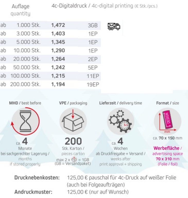 Snack Stick aus weißer Folie oder transparenter Folie. Werbeanbringung als Direktdruck in 4c individuell bedruckbar.