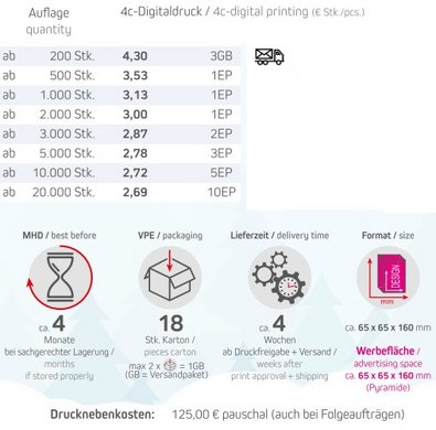 Werbefläche: ca. 65 x 65 x 160 mm (Pyramide)