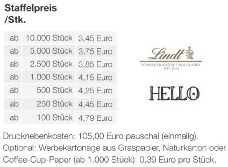 Preisliste 3D Präsent Container Lindt Hello Minis mit Logo Details