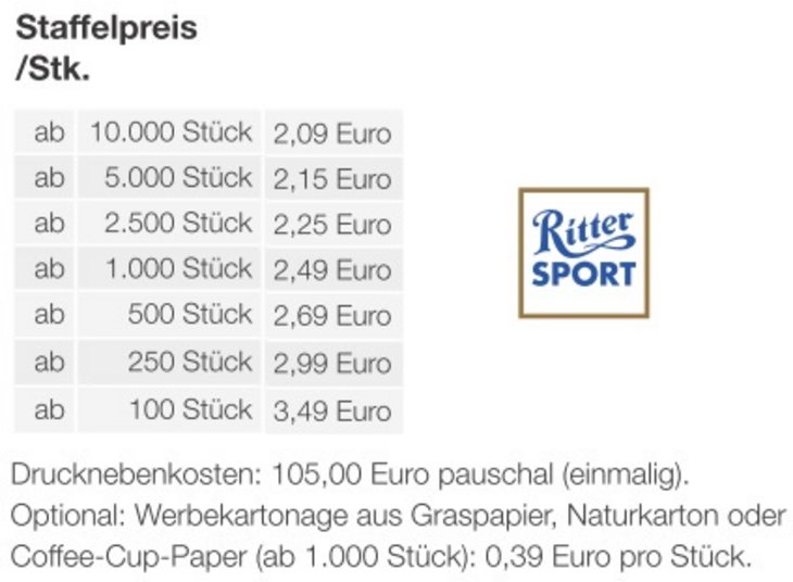 Preisliste 3D Präsent Container Ritter Sport mit Logo