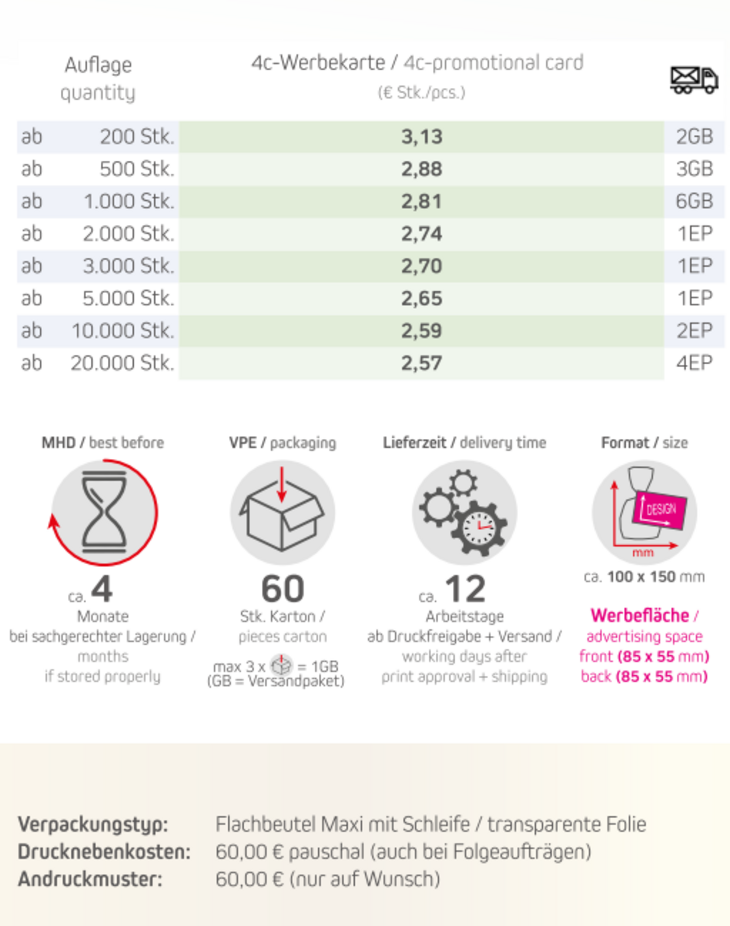 Inhalt: Bio Knusperkugeln-Mix ca. 30g Verpackungstyp: Flachbeutel Maxi mit Schleifer / transparente Folie Haltbarkeit: ca. 4 Monate bei sachgerechter LagerungFormat: ca. 100 x 150 x 40 mmWerbefläche: Werbekarte doppelseitig 85 x 55 mmLieferzeit: ca. 12 Arbeitstag ab Druckfreigabe + VersandDruckart: DigitaldruckMindestmenge: 200 Stk.VPE: 60 Stk. / Karton