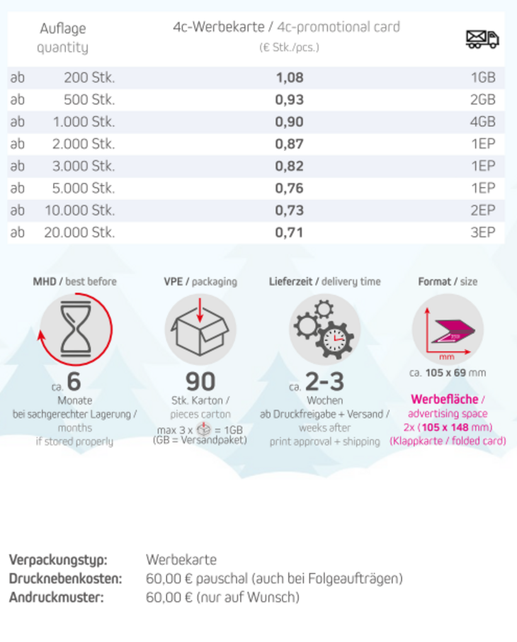Inhalt: Bio Zucker-StreuselHaltbarkeit: ca. 6 Monate bei sachgerechter LagerungNetto-Gewicht: ca. 15gVerpackungstyp: WerbekarteFormat: ca. 105 x 148 mmWerbefläche: 148 x 105 mmLieferzeit: ca. 2-3 Wochen ab Druckfreigabe + VersandDruckart: DigitaldruckMindestmenge: 200 Stk.
