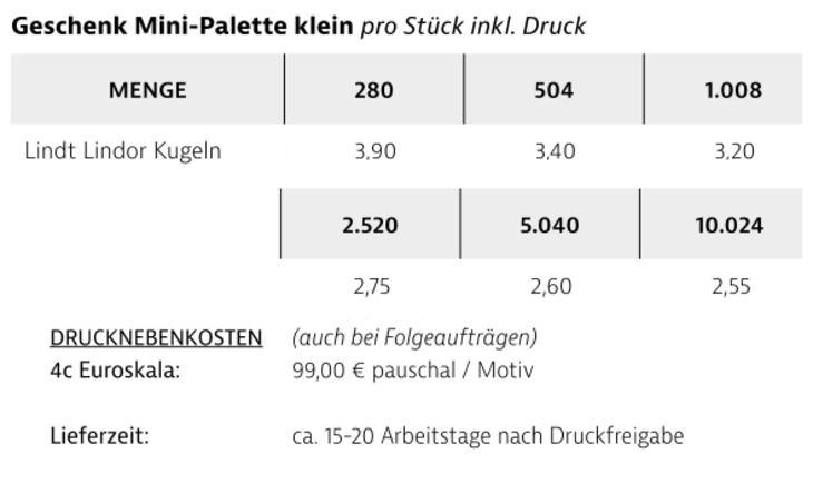Preisliste Geschenk Mini-Palette klein Lindt Lindor Kugeln mit Logo Details