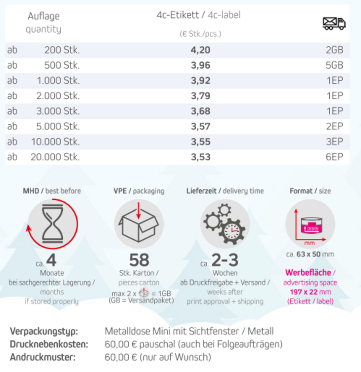 Preisliste Knusperkugel-Mix 45g in Metalldose Mini mit Sichtfenster schwarz mit Logo Details