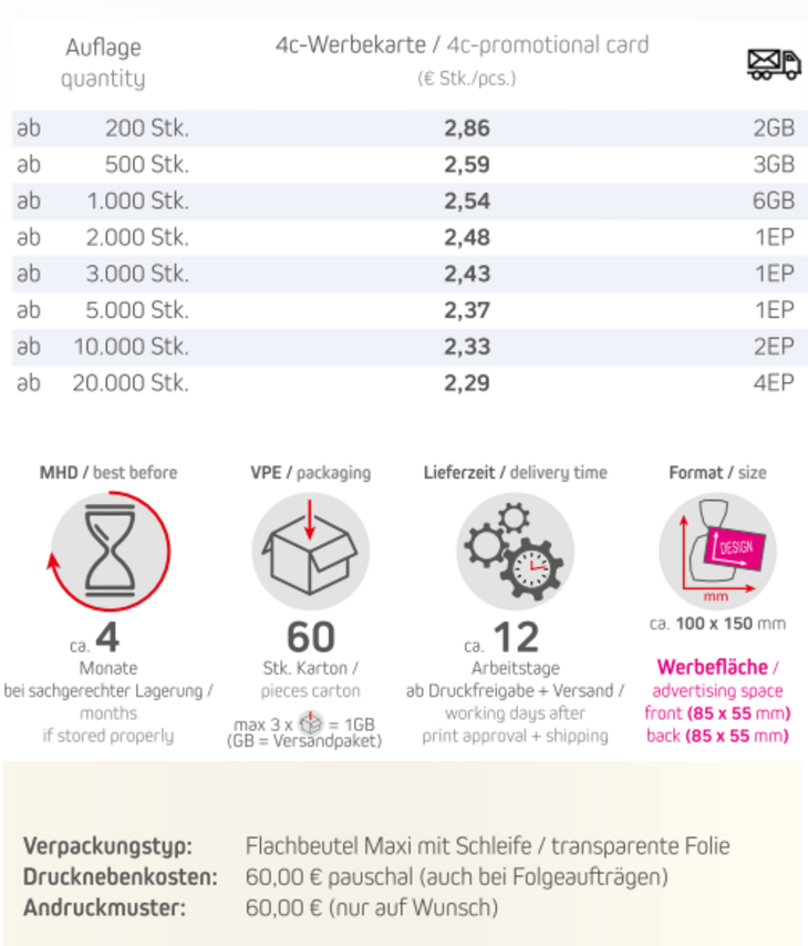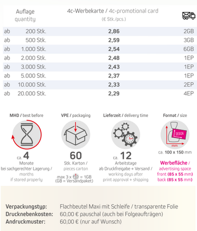 Inhalt: Knusperkugeln-Mix ca. 30g Verpackungstyp: Flachbeutel Maxi mit Schleife / transparente FolieFormat: ca. 100 x 150 x 40 mmWerbefläche: Werbekarte doppelseitig 85 x 55 mmHaltbarkeit: ca. 4 Monate bei sachgerechter LagerungLieferzeit: ca. 12 ARbeitstage ab Druckfreigabe + VersandDruckart: DigitaldruckVPE: 60 Stk. / KartonMindestmenge: 200 Stk.