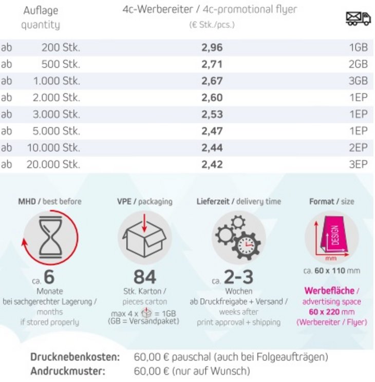 Süße Werbung von Herzen mit Schoko-Herzen! Diese zarten Edel-Vollmilch-Schokoladenherzen sind der perfekte Begleiter für jeden Anlass. Ob als kleine Aufmerksamkeit bei Events oder als liebevolles Giveaway für Ihre Kunden – die Schoko-Herzen sorgen für ein unvergessliches Geschmackserlebnis. Mit ihrem schokoladigen Charme und der herzlichen Form bringen sie Ihre Marke auf eine ganz besondere Weise ins Gespräch. Verschenken Sie Liebe und lassen Sie Ihre Werbung auf süße Weise im Gedächtnis bleiben! Ideal für alle, die ihrer Werbebotschaft ein wenig Herz und viel Genuss verleihen möchten. Ein süßer Moment, der gerne geteilt wird.Verpackungstyp: Standbeutel mit WerbereiterInhalt: Schoko-Herzen 36g Format: ca. 60 x 110 x 45 mmWerbefläche: ca. 60 x 220 mmLieferzeit: ca. 10 Arbeitstage ab Druckfreigabe + VersandDruckart: DigitaldruckHaltbarkeit: ca. 6 Monate bei sachgerechter LagerungMindestmenge: 200 Stück