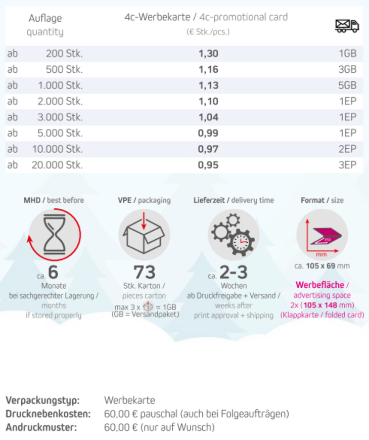 Haltbarkeit: ca. 6 Monate bei sachgerechter LagerungNetto-Gewicht: ca. 5gVerpackungstyp: WerbekarteFormat: ca. 105 x 148 mmWerbefläche: 105 x 148 mmLieferzeit: ca. 2-3 Wochen ab Druckfreigabe + VersandDruckart: DigitaldruckMindestmenge: 200 Stk.