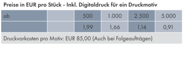 Mailingverstärker - Informationsträger - Sanfte Luftzufuhr Wenn es heiß hergeht oder Informationen übersichtlich dargestellt werden sollen, ist unser Werbe-Fächer die perfekte Lösung. Durch eine einfache Stecktechnik wird aus dem mailingfähigen Werbe-Fächer ein großer und auffälliger Informationsträger. Mit insgesamt 7 individuell gestaltbaren Fächerteilen, die auf beiden Seiten bedruckt werden können, bietet dieser Fächer reichlich Platz für Ihre Botschaften, Speisekarten, Daten und vieles mehr.Perfekt für Events, Messen, Produkt- und Servicepräsentationen oder als kreatives Mailing! Maße: Offen ca. 28,0 x 16,5 cm, Zusammengeklappt ca. 16,5 x 7,6 cmGewicht: ca. 21 gDruck: Digitaldruck, 4/4-c-EuroskalaMindestbestellmenge: 500 StückLieferzeit: ca. 3-4 Wochen nach Druckfreigabe