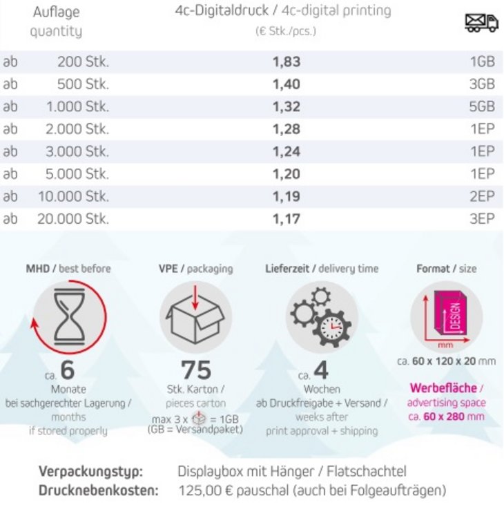 Klein, aber oho! Diese Mini-Schoko-Weihnachtsmänner aus zartschmelzender Vollmilchschokolade sind die perfekte kleine Aufmerksamkeit für Ihre Kunden oder Kollegen. Ob als kleines Geschenk oder als Highlight in der weihnachtlichen Kaffeepause – diese Schokoladenfiguren sind ein echter Hingucker und lassen den Weihnachtszauber auf einfache Weise in die Herzen Ihrer Liebsten oder Geschäftspartner einziehen. Ideal auch als Werbemittel, um Ihre Marke auf süße Weise zu präsentieren.Inhalt: Mini+ Schoko-Weihnachtsmann, ca. 15gHaltbarkeit: ca. 6 Monate bei sachgerechter LagerungNetto-Gewicht: ca. 15gVerpackungstyp: Displaybox mit HängerFormat: ca. 60 x 120 x 20 mmWerbefläche: Türhänger komplett rundum (gemäß Standskizze)Lieferzeit: ca. 4 Wochen ab Druckfreigabe + VersandDruckart: DigitaldruckMindestmenge: 200 StückZutaten Mini+ Schoko-Weihnachtsmann: VollMILCH-Schokolade (Kakao 30% mindestens), Zucker, Kakaobutter, VollMILCHpulver, Kakaomasse, SÜSSMOLKEpulver, Emulgator SOJAlecithine, Bourbon Vanilleextrakt. Kann Spuren von HASELNÜSSEn und ERDNÜSSEn enthalten.Nährwerte pro 100g: Energie: 2276 kJ / 545 kcal, Fett: 32 g, davon gesättigte Fettsäuren: 20 g, Kohlenhydrate: 57 g, davon Zucker: 57 g, Eiweiß: 5,5 g, Salz: 0,25 g