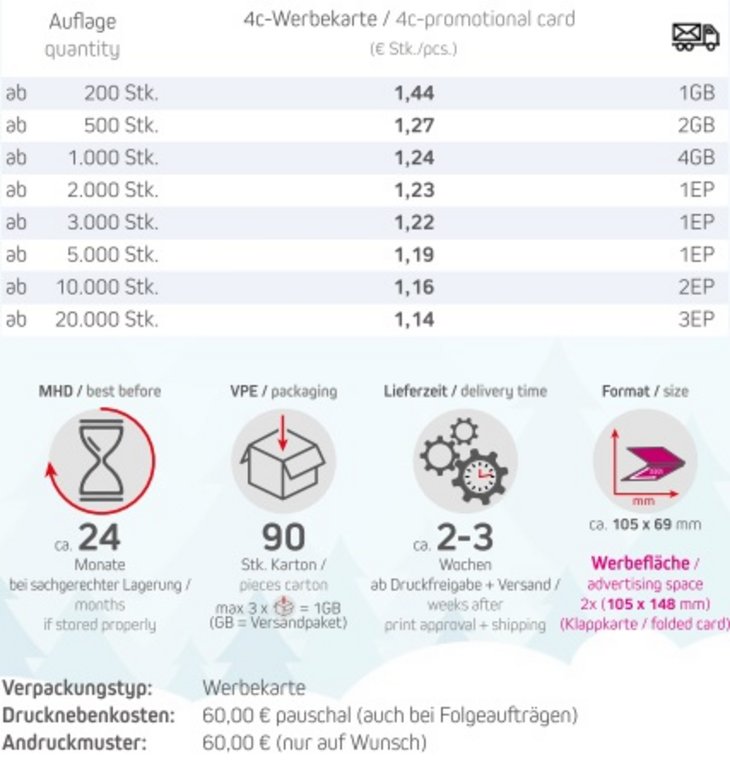 Verschenken Sie ein Stück Gesundheit! Unsere Heiße Zitrone ist angereichert mit Vitamin C und Zink, die Ihr Immunsystem in der kalten Jahreszeit stärken. Perfekt für eine wohltuende Erfrischung und ein ideales Giveaway, das nicht nur wohltuend ist, sondern auch für eine Portion Wärme und Vitalität sorgt!Haltbarkeit: ca. 24 Monate bei sachgerechter LagerungVerpackungstyp: WerbekarteFormat: ca. 105 x 69 mmWerbefläche: 105 x 148 mmLieferzeit: ca. 2-3 Wochen ab Druckfreigabe + VersandDruckart: DigitaldruckMindestmenge: 200 Stück