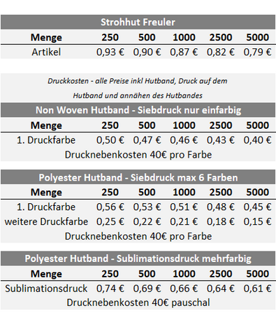 Preisliste Strohhut mit Logo Freuler Details