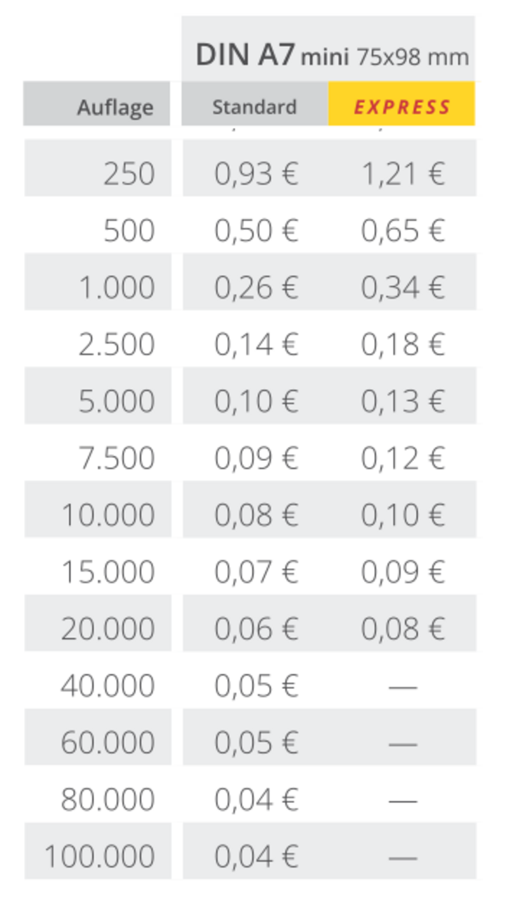 • WM-Planer passt in jede Hosentasche • Perfekt auch als Beilage im Post- oder Paketversand 16-seitig im Wickelfalz, ca. DIN A7 (75 x 98mm) auf hochwertigem Papier (135g Bilderdruck glänzend) PERSONALISIERUNG Schritt 1: Cover Werbefläche auswählen Vorderseite der Pocketplaner in verschiedenen Designs erhältlich (siehe weitere Informationen / Cover Werbefläche) Auf jeder Vorderseite kann Ihr Logo platziert werden. Alternativ binden wir Ihre eigene Werbefläche ein. Außerdem ist auf der Rückseite ebenfalls Platz für Ihr Logo sowie Ihre Adresse. Schritt 2: Spielplan-Layout Farbvariante Die Farbvariante beeinflusst farbige Elemente wie Überschriften, Gestaltungselemente usw. im Spielplan-Layout. Standard-Farbe: anthrazit oder Einbindung Ihrer Unternehmensfarbe: + 59 € Inklusive für Sie: - Einbindung Ihres Logos - Auf Wunsch: Einbindung Ihrer eigenen Werbefläche - Visualisierung zur Voransicht - Versand an eine Adresse in Deutschland Abnahmemengen nur nach angegeben Preistaffeln, keine Zwischenmengen möglich Mindestbestellmenge: 250 Stück Lieferzeit: ab Druckfreigabe ca. 5 – 7 Werktage oder Express ca. 3 – 4 Werktage