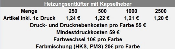 Preisliste Heizungsentlüfter mit Kapselheber mit Logo