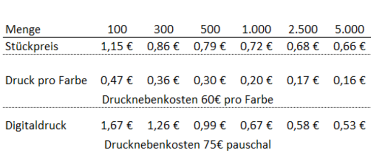 Maße: ca. 125 x 41 x 10 mmGewicht: 43 gDruckart: Tampondruck oder DigitaldruckDruckfläche: Tampondruck: 67x14 mm (max. 4c)DigitaldrucK: 79 x 19 mmMaterial: Kunststoff und MetallVerpackungs-Einheit: 1 je Polybeutel / 50 je Unterkarton / 450 je VersandkartonGrundfarben: weiß, rot, blau, gelbMindestbestellmenge: 100 StückLieferzeit: ca. 10 Arbeitstage ab Druckfreigabe