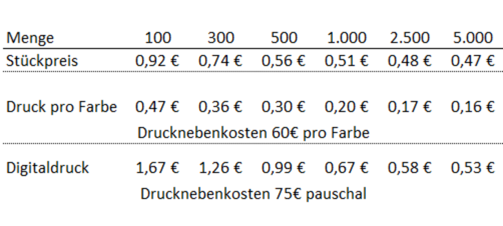Maße: ca. 93 x 40 x 11 mmFarben: blau, gelb, grün, rot, weißMaterial: Metall (MET), Polypropylen (PP), Polystyrol (PS)Druckart: Siebdruck oder DigitaldruckDruckfläche: Siebdruck: 45x33 mm Digitaldruck: 45x33 mmGewicht: 23gVerpackungs-Einheit: 1 je Polybeutel / 100 je Unterkarton / 1000 je VersandkartonMaterial: Kunststoff und MetallMindestbetellmenge: 100 Stück
