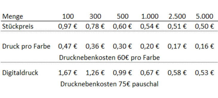 Maße: ca. 93 x 41 x 12 mmMaterial: Metall (MET), Polyethylen (PE), Polystyrol (PS)Farben: weiß, rot, grün, blau, gelb, orange oder schwarzDurckart: Siebdruck oder DigitaldruckDruckfläche: Siebdruck: 50 x 30 mmDigitaldruck: 90 x 37 mmVerpackungs-Einheit: 250 je VersandkartonMindestbestellmenge: 100 Stück Lieferzeit: ca. 10 Tage ab Druckfreigabe