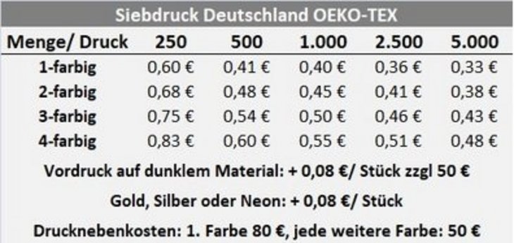 Die Werbetasche New York ist eine flache Einkaufstasche und eine umweltfreundliche Alternative zur Plastiktüte. Sie besteht aus 100% OEKO-TEX zertifizierter Baumwolle in strapazierfähiger Top-Qualität. New York eignet sich für Einkäufe und Messen gleichermaßen. Das klassiche Design mit abgerundeten Ecken, macht diese Tasche zum Werbeträger für alle Liebhaber weicher Formen. Das besonders gute Preis-Leistungsverhältnis zeichnet diese Tasche aus.Material: 100% OEKO-TEX® BaumwolleMaterialgewicht: 150 g/m²Maße: 45 x 42 cmVolumen: 17 LiterHenkel: 80 x 3 cmHenkellänge: langDruckfläche: 30 x 30 cmmax Anzahl Druckfarben: 6/6Farben: viele verschiedene Farben wählbar! Siehe Bild.VE: 250 StückMindestbestellmenge: 250 Stück