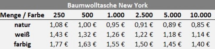 Preisliste Druck Baumwolltasche New York mit langen Henkeln
