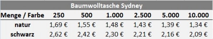 Preisliste Baumwolltasche Sydney mit kurzen Henkeln und Logo
