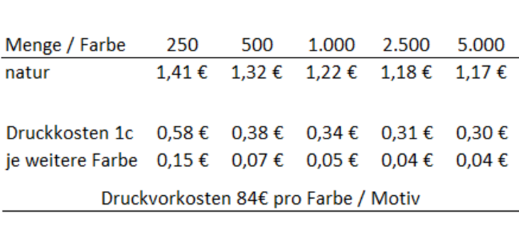 erhältliche Farbe: naturGröße der Tasche: ca. 28 x 32 cmGröße des Henkels: ca. 24 cm Material: 100 % BaumwolleGrammatur: ca. 140 g/m²Druckfläche: Siebdruck ca. 17 cm breit x 20 cm hochUrsprungsland: IndienZertifikatsnummer: FAIRTRADE • OEKO-TEX® STANDARD 100Lieferzeit: ca. 3-4 Wochen ab DruckfreigabeMindestbestellmenge: 250 Stück