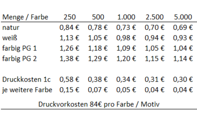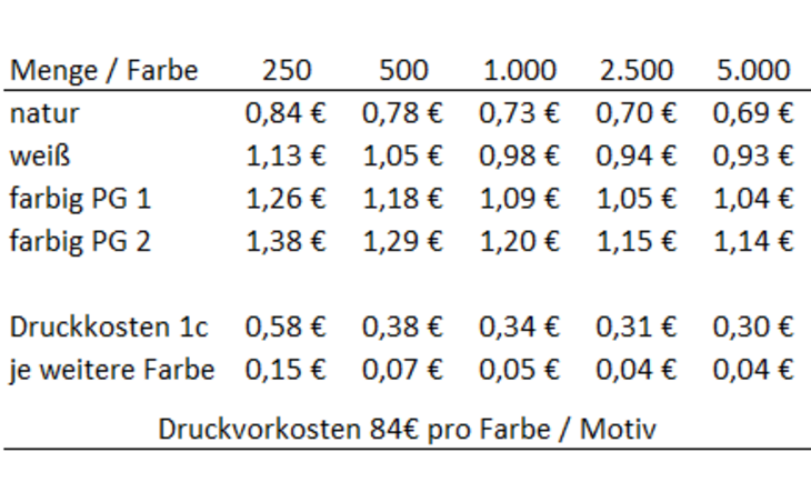 Farben Preisgruppe 1: hellgrau, grau, gelb, mandarin, rot, dunkelrot, rosa, pink, bordeaux, braun, hellgrün, maigrün, waldgrün, himmelblau, mint, smaragd, petrol, hellblau, royalblau, dunkelblau, stahlgrau, anhrazit oder schwarz